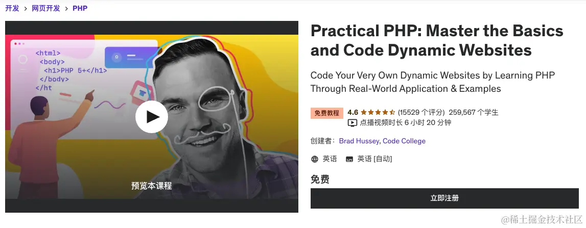 该课程由 Brad Hussey 授课,他是一名网页设计师、创作者和营销顾问。同时,他在 Udemy 上教授 12 门课程。这门实用的 PHP 课程目前是该领域最受欢迎的。注册人数已超过 250,000 人,总体评分是 4.5 星(满分 5 星)