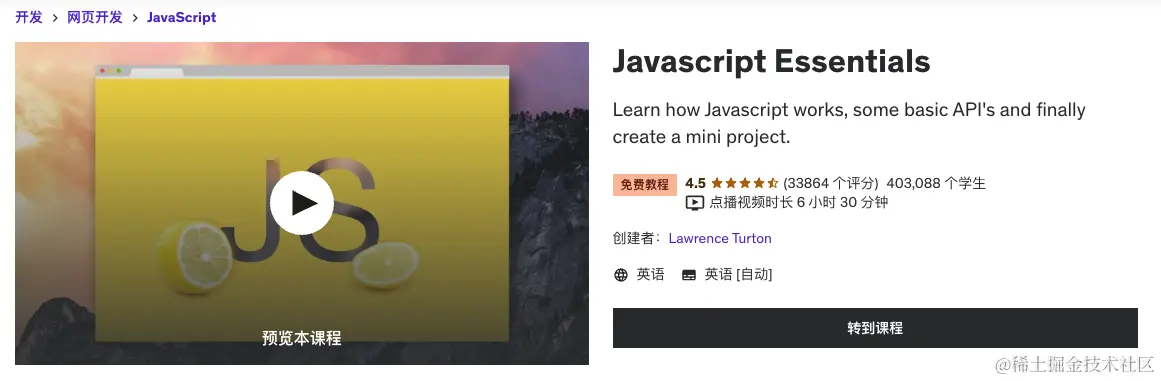 第一门免费课程是:JavaScript Essentials。顾名思义,本课程旨在帮助您掌握 JavaScript 的基础知识。该课程涵盖基本的 API 并以一个迷你项目结束。这是一个相当小的课程,您仅需要花费6小时30分钟就可以学习完成。