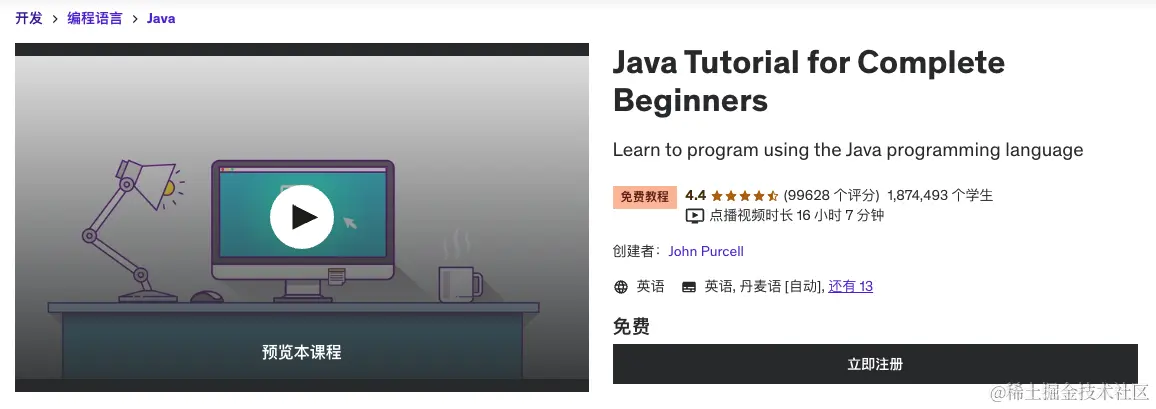 该课程由 John Purcell 授课。他作为软件开发人员在大公司工作了 14 年。目前 John 在 Udemy 上教授 19 门课程。该课程也是这个分类中目前最受欢迎的课程。截至目前,已有近200万学生观看学习,还有近10万条评论,总体评分为 4.5 分(满分 5 分)。