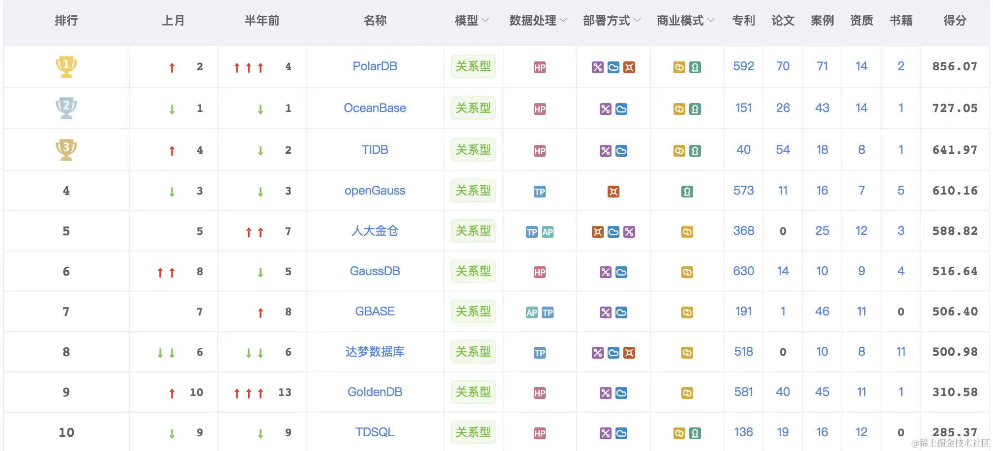 本月PolarDB首次夺得榜首,刷新榜单总分记录,成功打破了OceanBase连续14个月的冠军地位。尽管OceanBase略居第二,但其连续14个月的领先地位和强大的品牌影响力不可忽视。TiDB上升一位,夺得探花地位。而openGauss和人大金仓紧随其后,在开源生态和技术创新方面表现卓越,稳居榜单中。GaussDB、GBASE、达梦数据、GoldenDB和TDSQL等其他参与者也以独特的技术创新和市场表现稳居前十。这些成绩不仅代表了各自品牌的技术实力,同时也反映了数据库行业在满足日益增长的数据管理需求中的重要作用和未来潜力。让我们一起来看看排行榜前十名厂商的得分以及排名情况。
