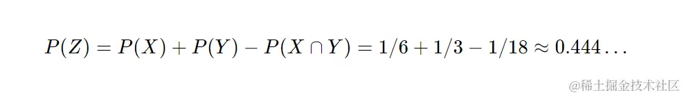 在这个特别的设置下,如果我们知道至少一个骰子满足条件(不管是_X_还是_Y_),我们想要找出在这种情况下,第一个骰子显示 6 的概率是多少,也就是_P(X|Z)_。