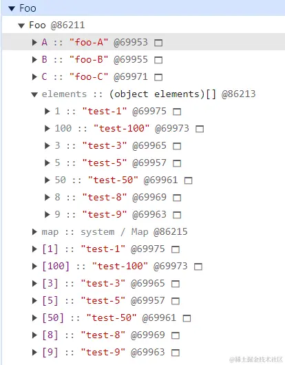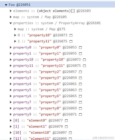 观察内存快照,发现对象中并没有properties,这是因为V8中的策略,当命名属性小于等于10 个时,命名属性保存为对象内属性,即与elements 和 properties处在同一层级,这样做的好处是可以直接访问这些命名属性不要再去访问properties对象,从而提升了属性查找的效率。