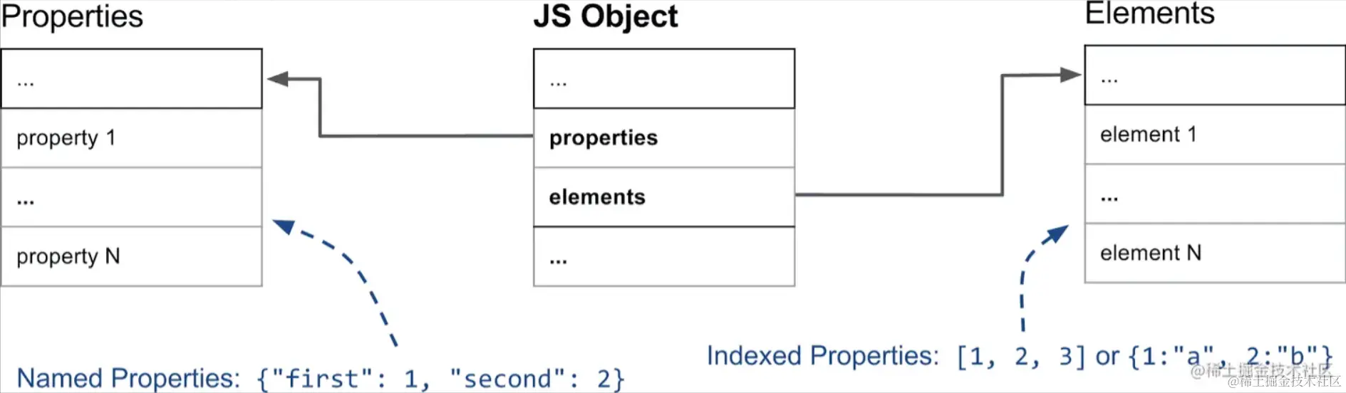 在V8中,前者被称索引属性,后者被称为命名属性,在遍历时会先遍历前者。两者在内存中分别存储在不同的地方,由对象中的两个指针指向它们,分别是elements 和 properties,如下图: