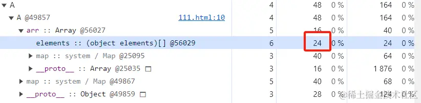 先声明一个长度为4,用1填充的数组,然后打一个内存快照,可以看到该数组占用24字节的内存空间:4*4+8=224