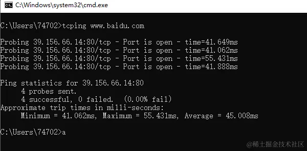 3.在cmd命令行里面使用tcping xxx即可,如port is open就是打开,默认80端口