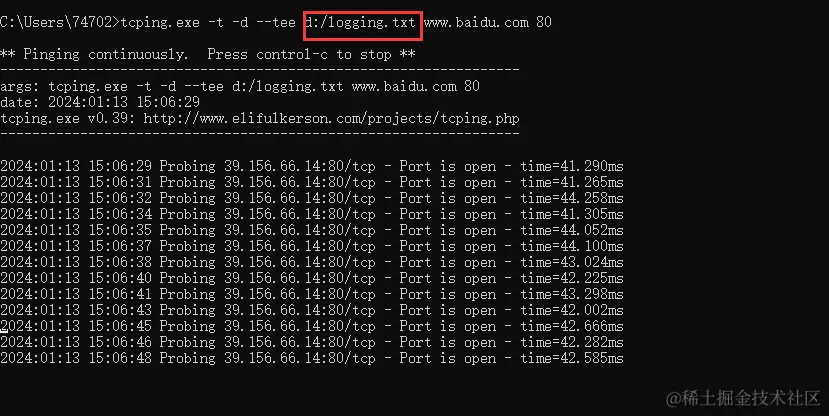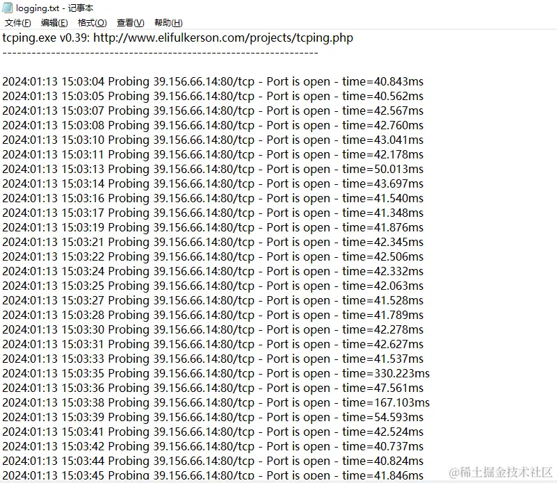 5.可以将tcping的测试结果保存到指定位置,如保存到D盘的logging.txt,就可以在D盘里面进行查看日志记录。