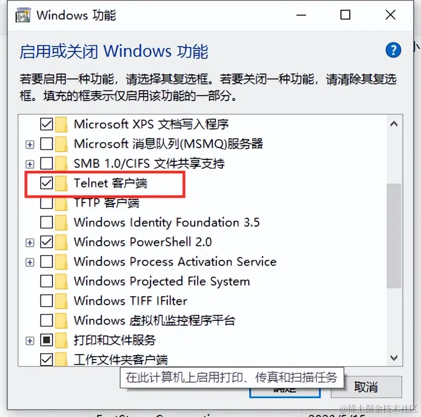 4.在“启动或关闭windows功能”中找到telnet客户端,打开即可,默认是关闭