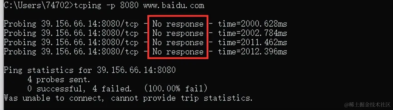 4.如ping www.Baidu.com的8080端口,使用 tcping -p 8080 www.baidu.com,可以看出8080端口是不通的。