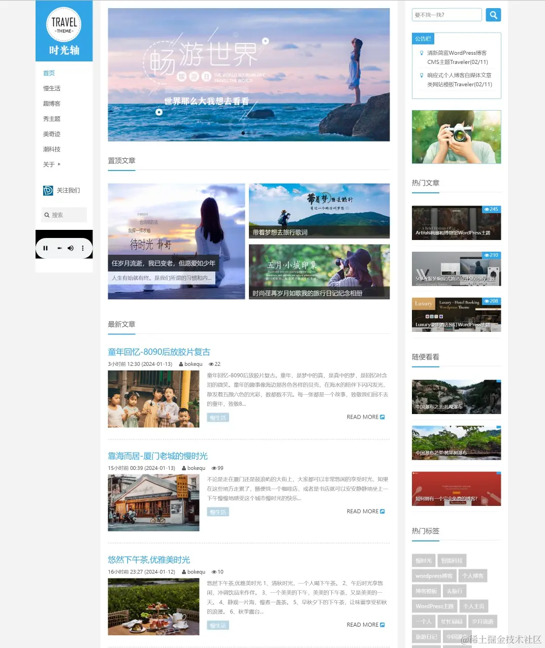 traveler模板主题在更大的程度上照顾每个人的需求,菜单、首页每个栏目、侧栏小工具都可以自主开启关闭,只需在后台简单操作,即可打造出一个属于自己的网站。