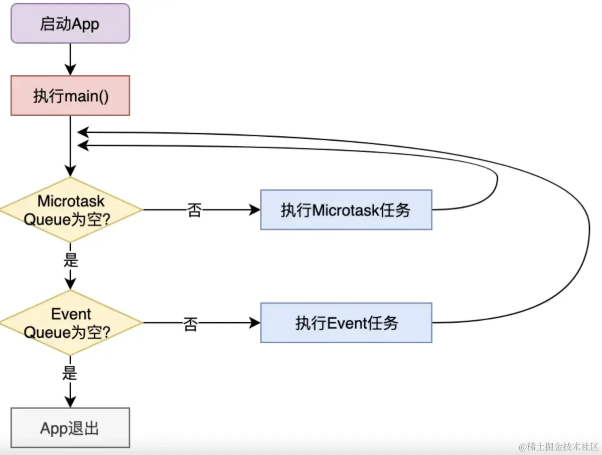 在每一次事件循环中,Dart总是先去第一个微任务队列中查询是否有可执行的任务,如果没有,才会处理后续的事件队列的流程。