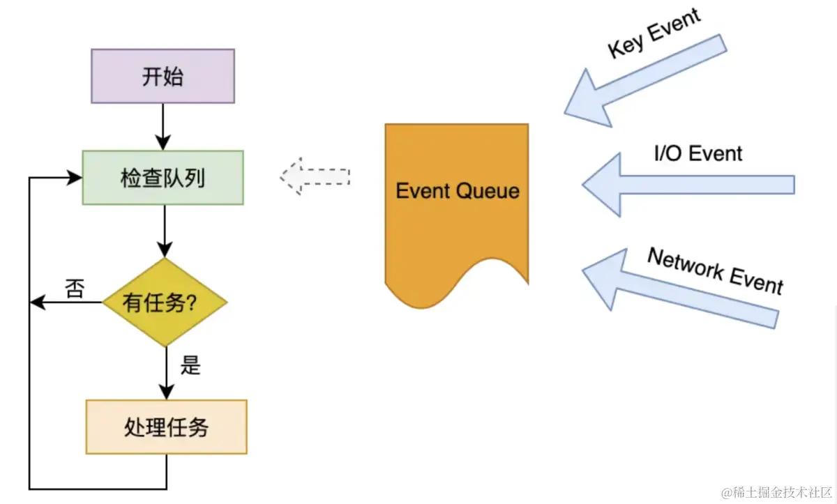 事实上事件循环并不复杂,它就是将需要处理的一系列事件(包括点击事件、IO事件、网络事件)放在一个事件队列(Event Queue)中。