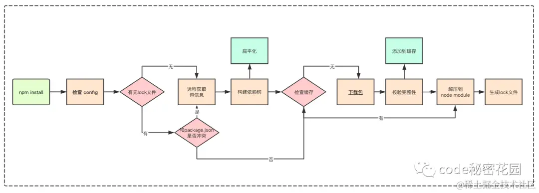 检查 package.json 中的依赖版本是否和 package-lock.json 中的依赖有冲突。 如果没有冲突,直接跳过获取包信息、构建依赖树过程,根据 package.json 构建依赖树,直接跳到第六步。