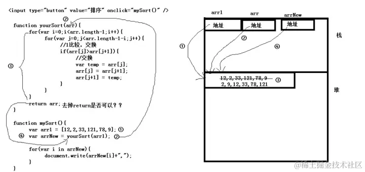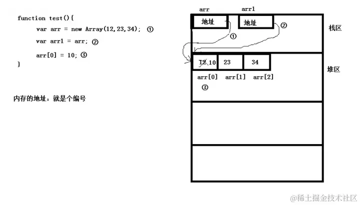 如果给arr[0]赋值的话,arr1[0]的值也会发生变化,因为,arr和arr1保存着相同的地址,它门两个引用的数据是共享的。就像你在很多地方(简历的那张纸,户口本上的那张纸)会写上你的家庭地址。这么多张纸都引用着你家。根据一张纸上找到你家,给你家放上一百万的现金(数据改变了,相当于arr[0]=10),再根据另外一张纸的地址也找到了你家,你发现你一百万在(不要给我说被人拿了)