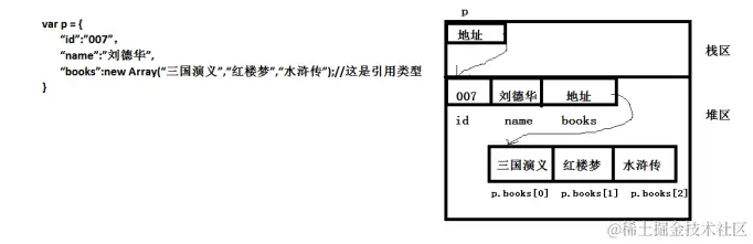 "books":new Array("三国演义","红楼梦","水浒传")//这是引用类型