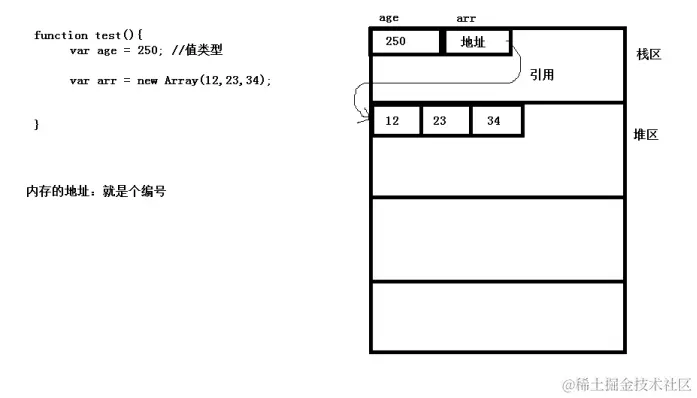 (1)基本类型:就是值类型,即在变量所对应的内存区域存储的是值,如:上面的age变量所对应的内存存储的就是值250.