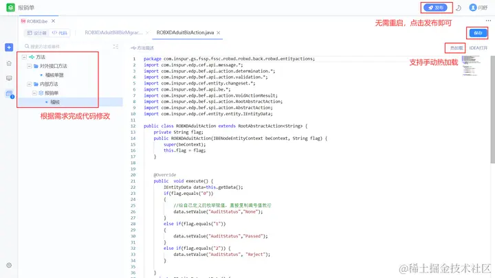 构件热加载指的是:构件代码修改后,无需重启应用,通过WebIDE的部署或发布工程后,即可正常调用。