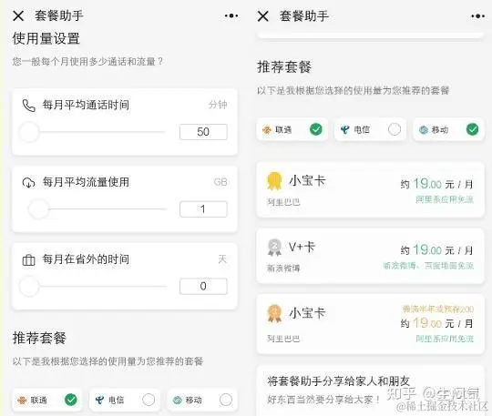 套餐助手可以根据我们对通话时间、流量的需求情况,自动列出满足要求的套餐供我们选择。