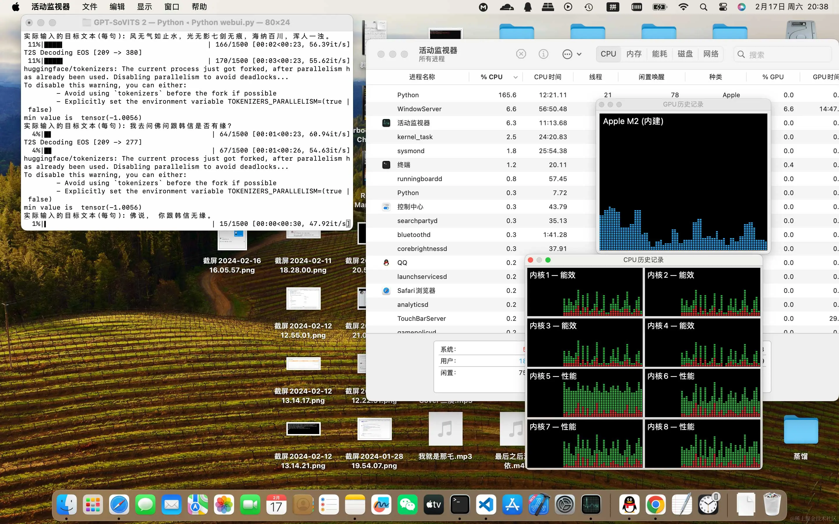 作为对比,使用MPS进行推理,GPU推理时,Python进程内存占用持续稳步上升至14GB,推理速度最高30it/s,偶发1-2it/s。