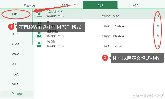 步骤2:在选择输出格式界面,切换至 【音频】 窗口,选中MP3格式,并根据需要进行一些其他设置,如 【自定义格式参数】 等。