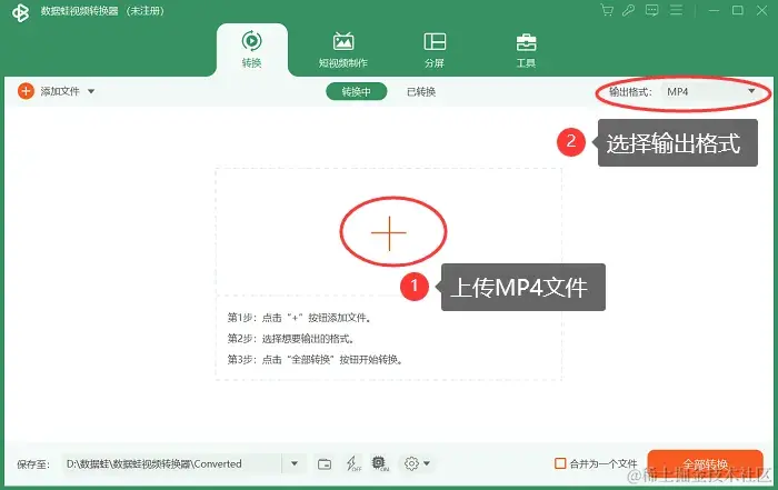 步骤1:下载并安装一款专业的视频转换软件,如数据蛙视频转换器。打开软件并导入你的MP4文件,点击 【输出格式】 按钮。