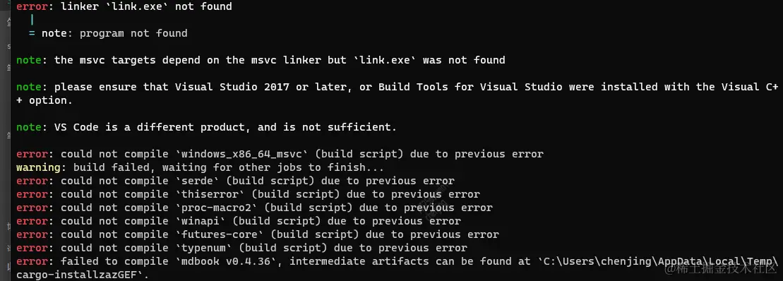 link.exenot found| = note: program not foundnote: the msvc targets depend on the msvc linker butlink.exewas not foundnote: please ensure that Visual Studio 2017 or later, or Build Tools for Visual Studio were installed with the Visual C++ option.note: VS Code is a different product, and is not sufficient.