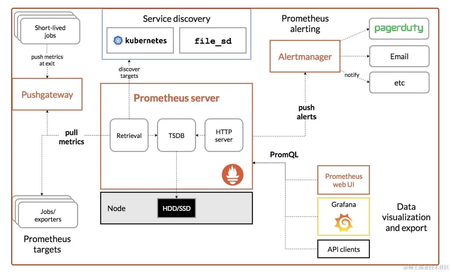 - Prometheus Server: 存储和检索时序数据的核心,定期从配置的监控目标拉取指标。