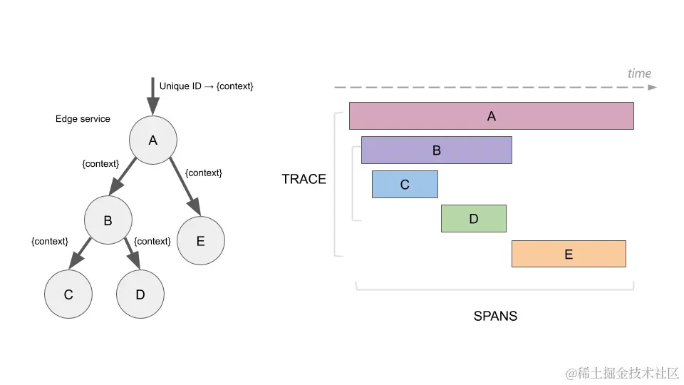 一个 Span 表示 Jaeger 的逻辑工作单元,Span 具有操作名称,操作的开始时间,和持续时间。Span 可以嵌套并排序以建立因果关系模型。