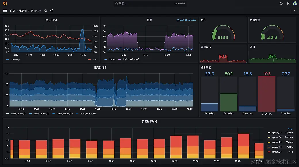 业务指标: 将业务中的一些核心指标、队列长度、异常情况、等业务度量输出,然后通过 grafana 配置面板进行展示和预警, grafana 的使用具体后面会介绍到。