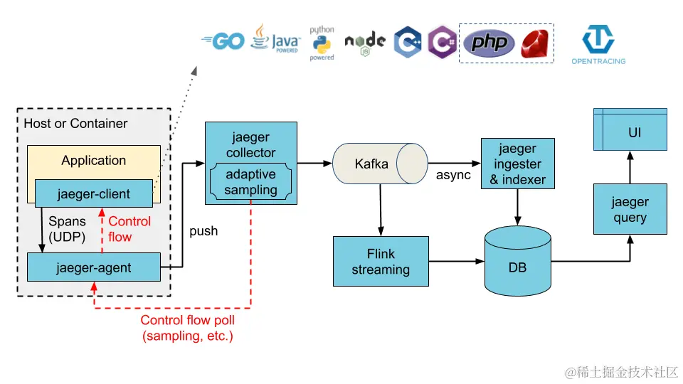 - Jaeger Client 为不同语言实现了符合 OpenTracing 标准的 SDK。应用程序通过 API 写入数据,client library 把 trace 信息按照应用程序指定的采样策略传递给 jaeger-agent。
