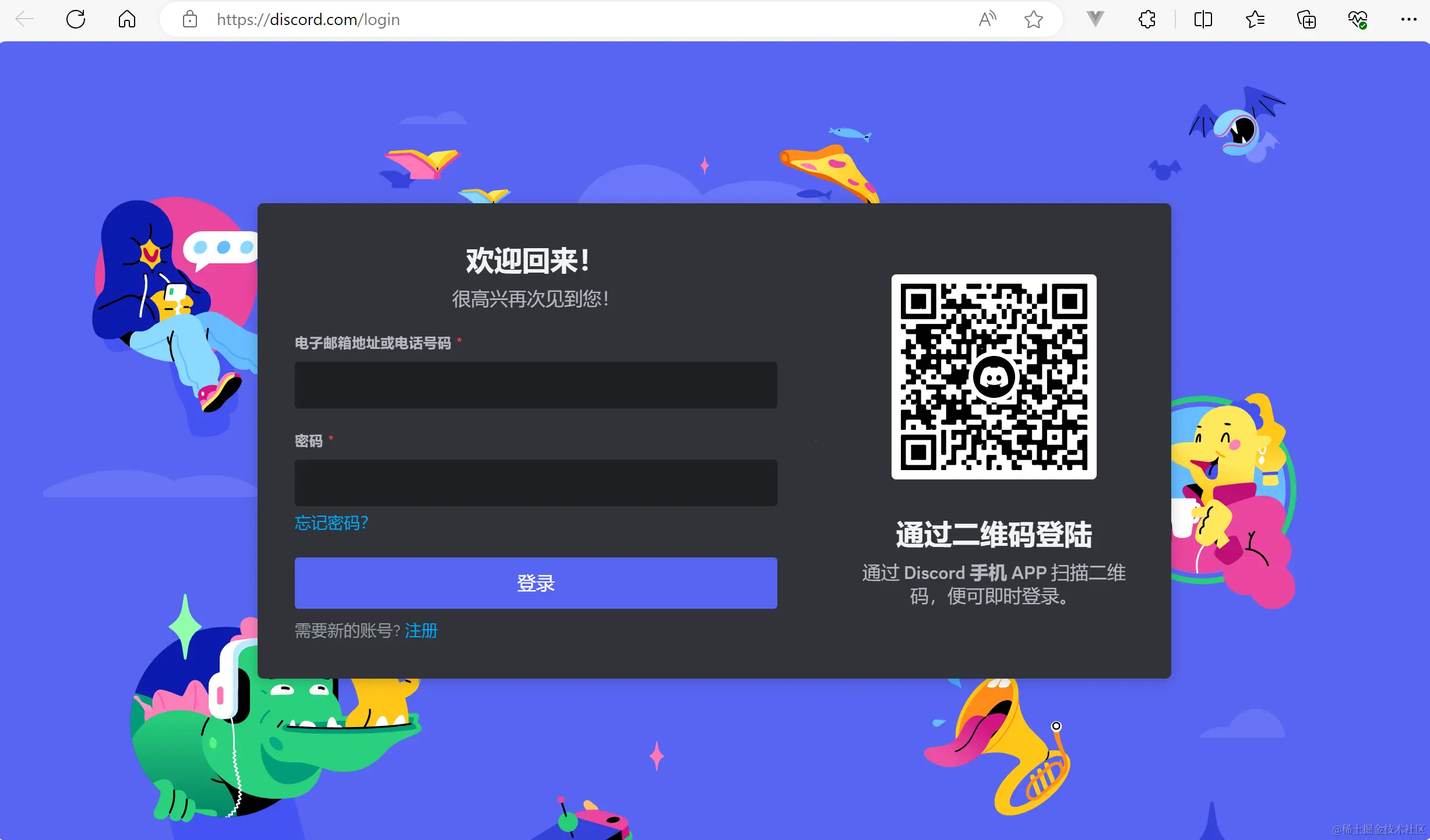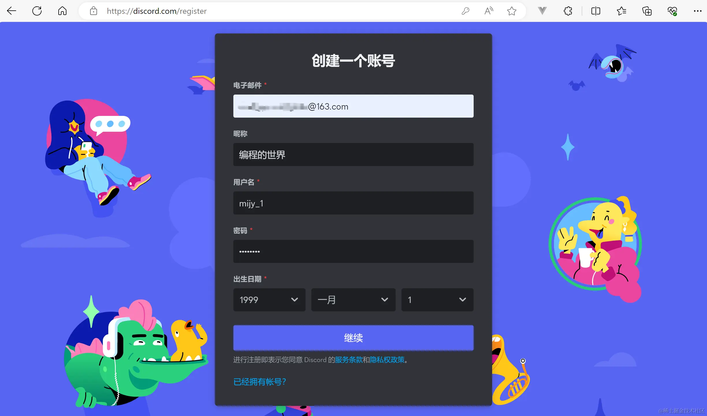 如果没有账号要先进行注册:discord.com/register,这里我使用的是163邮箱