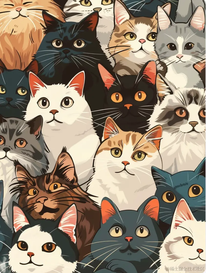 一旦踏入MJ的画室,我们可以简单地通过与它聊天,告诉它我们想要的画面。比如,你可以说:“嘿MJ,按照宫崎骏动画的风格创作一张展示猫的图片,每只猫都代表一个独特的性格和表情。”然后,在不到一分钟的时间里,MJ就会以其神奇的AI算法,将你的描述转化为一幅令人惊艳的图画,展现在聚会场所的大屏幕上。