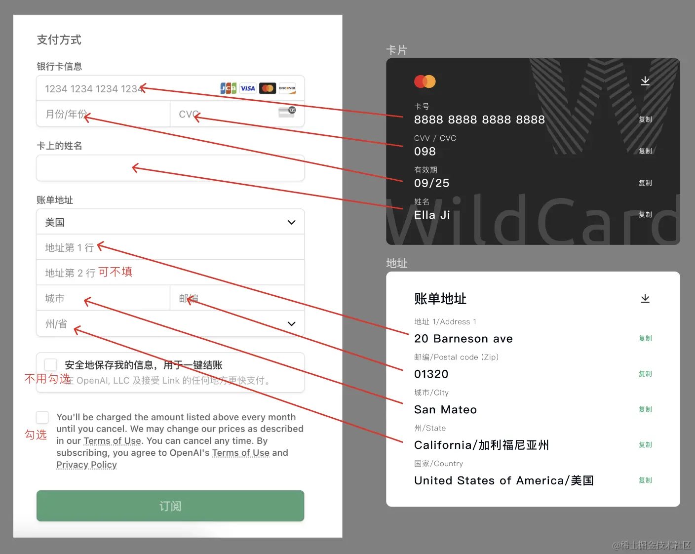 在弹出的绑定支付页面,依次输入卡号、有效月份/年份、CVC(即您的 CVV )、美国的账单地址及姓名便可成功绑定