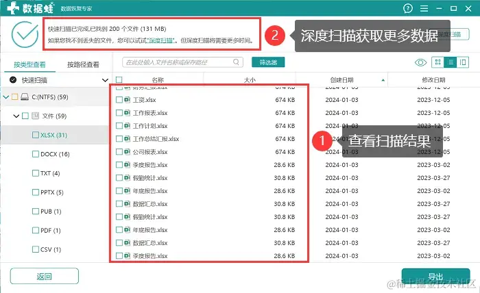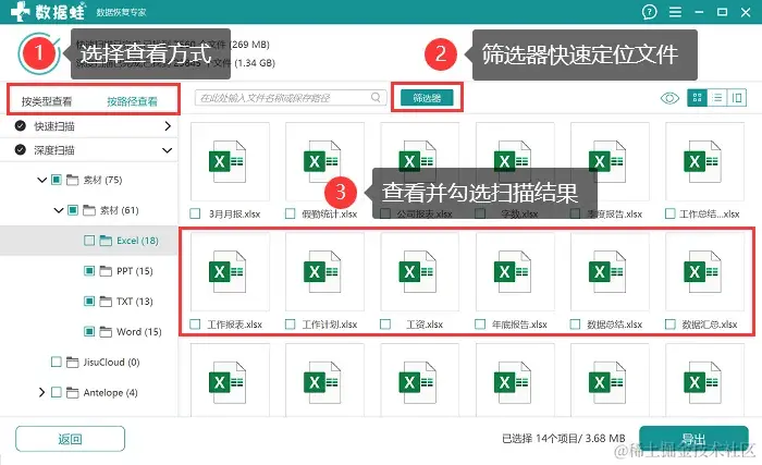 步骤4:在深度扫描结束后,软件会将有机会恢复的文件都呈现出来,此时用户可以按不同的文件类型或路径对扫描结果进行查看,也可以直接在 【筛选器】 中输入相关的条件快速定位文件;