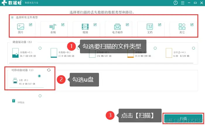 步骤2:将需要恢复的文件类型勾选上,并勾选上【u盘】,点击执行【扫描】 ;