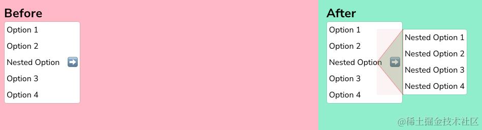 在鼠标的每个位置,你可以想象鼠标当前位置与下拉菜单的右上角和右下角之间形成一个三角形。如果下一个鼠标位置在该三角形中,说明用户可能正在将鼠标移向当前显示的子菜单。Amazon 利用这一点实现了很好的效果。只要鼠标停留在该蓝色三角形中,当前子菜单就会保持打开。如果鼠标移出该三角形,他们会立即切换子菜单,使其感觉非常敏捷。