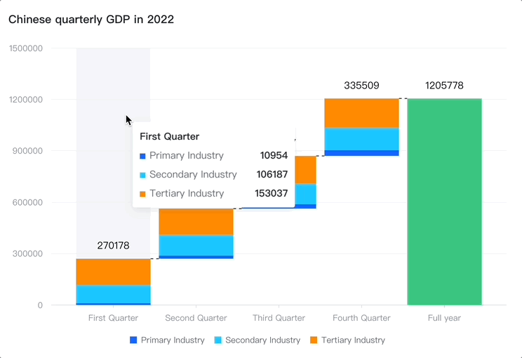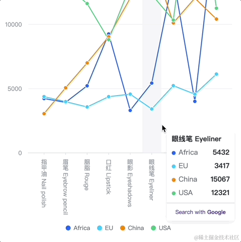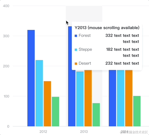 作为对比,ECharts 的 tooltip 虽然同样支持 enterable 属性,但是 ECharts 主要通过简单的 tooltip 缓动来支持鼠标移入,鼠标仍需要不停地“追逐” tooltip 才能移至其中,灵活性便打了折扣。以下为 ECharts 的效果: