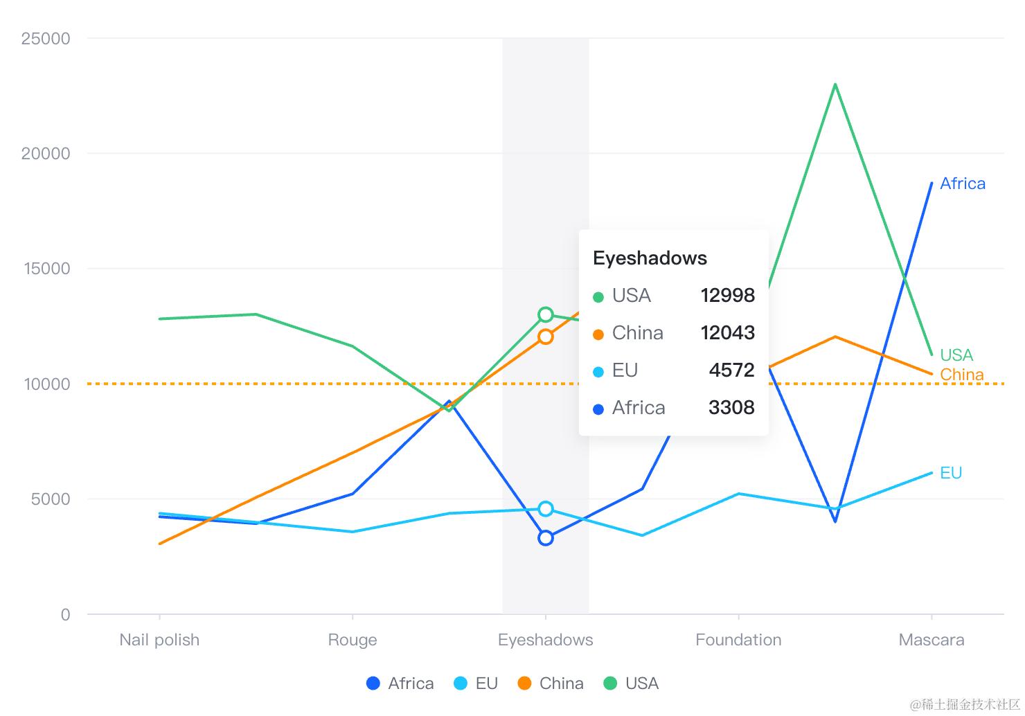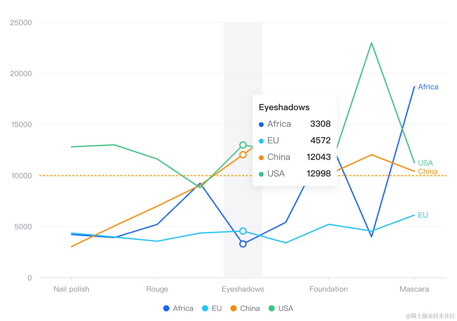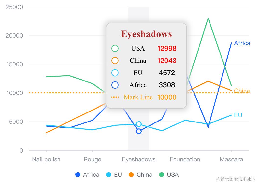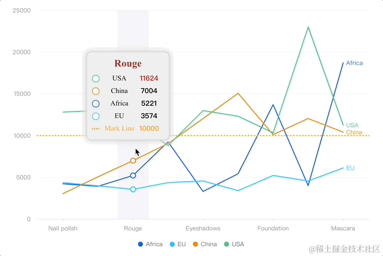 在这个图表中,用户配置了一条 y=10000 的标注线。同时要求在 dimension tooltip 中实现: