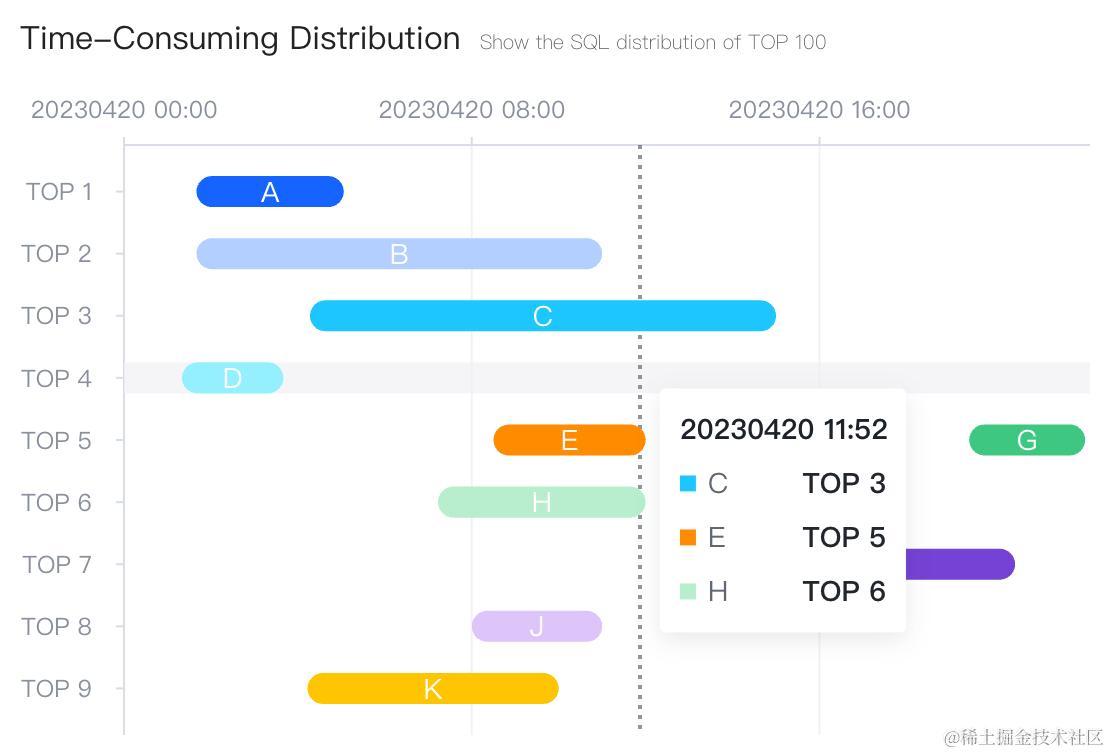 一般的 dimension tooltip 会在离散轴(纵轴)触发 tooltip,汇总连续数据(对应于时间轴)。而 VChart 同时支持这两种方式的 tooltip。