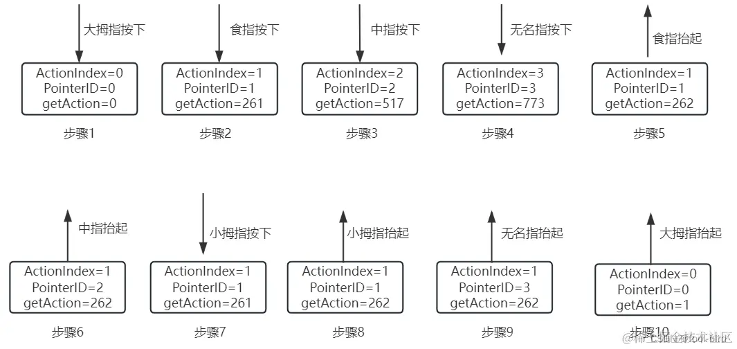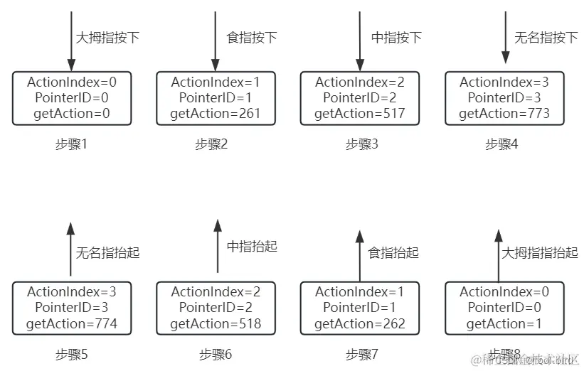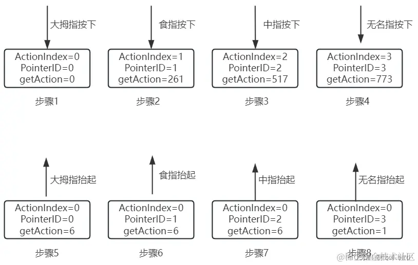 我们直接看图八中的步骤6,食指抬起后,中指的ActionIndex为1这个好理解,步骤7小拇指按下时,我们看到它的ActionIndex为1 ,PointerID为1,后者为1是因为复用了前面回收的PointerID, 由于源码中getaction值是native层计算的,不方便查看 ,ActionIndex为1我猜测是存储PointerID的数组在加入1后,又按从小到大的顺序进行了重排序,然后新的数组下标就作为了ActionIndex, 所以我们在实际应用中,应该使用PointerID追踪多指触摸事件 。