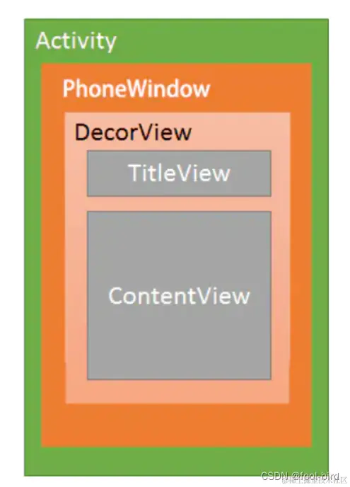 下面说下事件的分发机制,说分发机制前,先提一下安卓视图的层级结构,下图中最里面的ContentView就是我们自定义的各种页面,里面包含各种ViewGroup和View