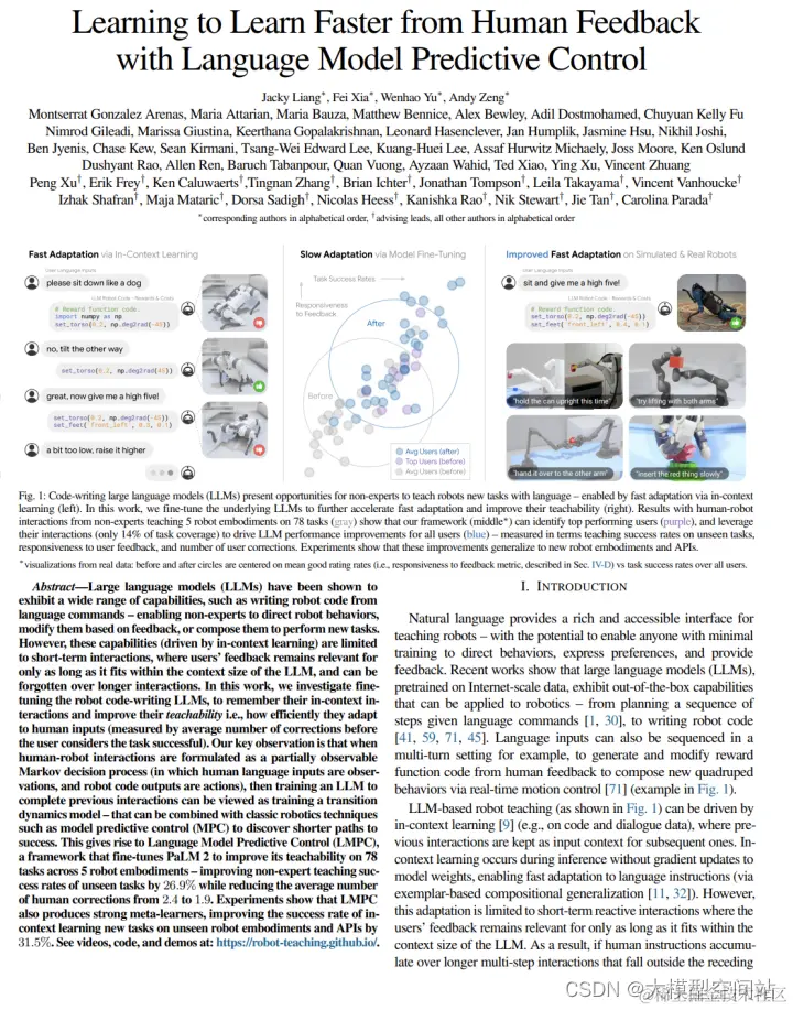 大语言模型 (LLMs) 已经显示出各种能力,比如从语言命令编写机器人代码 -- 可让非专家指导机器人行为,根据反馈修改它们,或组合它们执行新任务。然而,这些能力(由上下文学习驱动)仅适用于短期互动,其中用户的反馈仅在符合LLM上下文大小的情况下才保持相关,并可能在长期互动中被遗忘。在这项工作中,我们调查了微调写机器人代码的LLMs,以记住它们的上下文互动并改善它们的可教性,即它们如何有效地适应人类输入(通过用户认为任务成功之前的平均更正次数进行测量)。我们的关键观察是,当人机互动被制定为部分可观察的马尔可夫决策过程(其中人类语言输入是观察值,机器人代码输出是动作)时,那么训练LLM来完成先前的互动可以被视为训练转移动力学模型 -- 可与经典机器人技术(如模型预测控制MPC)结合,发现成功的更短路径。这催生了语言模型预测控制(LMPC)框架,通过对5个机器人实例中的78个任务对PaLM 2进行微调以提高其可教性 -- 将未见任务的非专家教学成功率提高了26.9%,同时将人类更正的平均次数从2.4降低到1.9。实验证明,LMPC也能生成强大的元学习者,将在未见的机器人实例和API上学习新任务的成功率提高了31.5%。请查看视频,代码和演示:robot-teaching.github.io/。