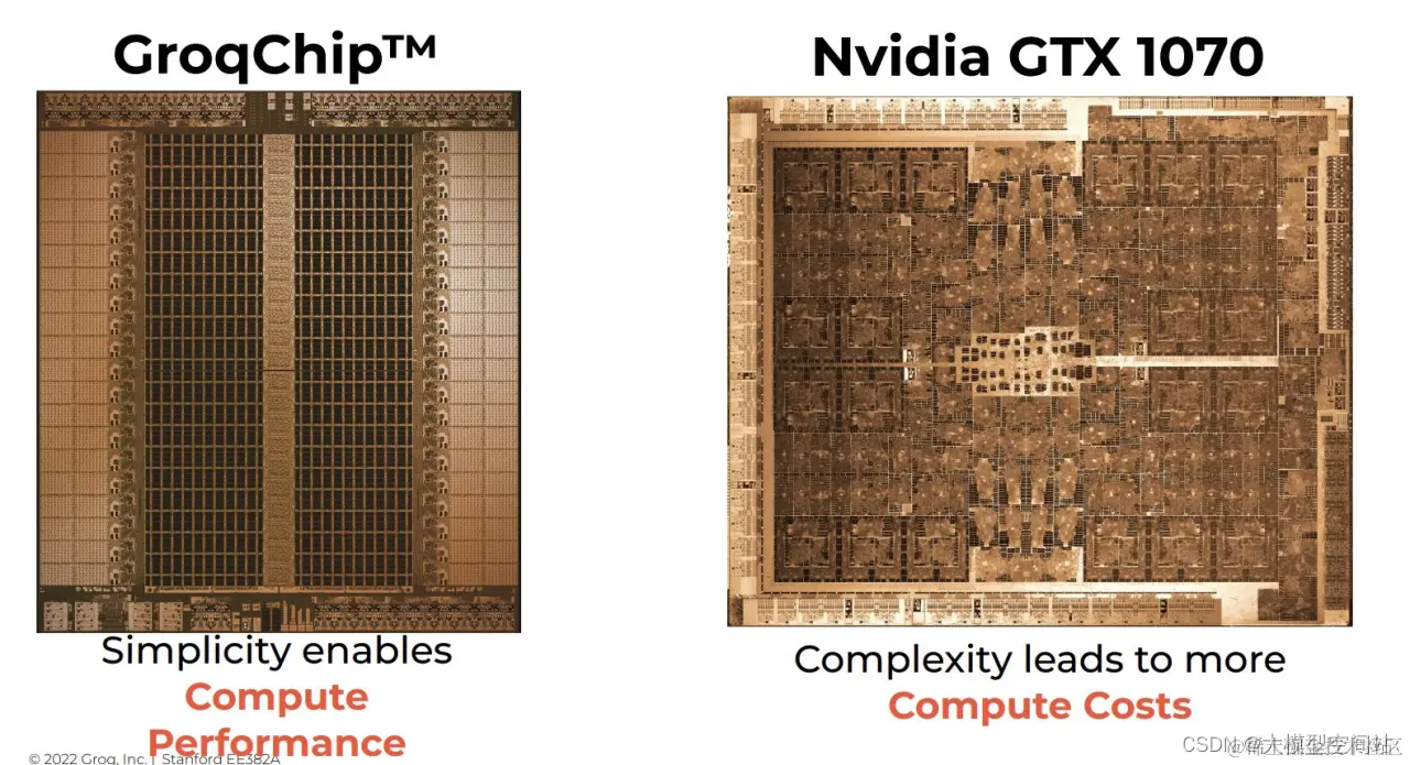 关键的洞察是,许多AI芯片堆叠了组件,如GPU,这带来了额外的硬件和膨胀。Groq回归基本原理,认识到机器学习工作负载关乎在简单数据类型和操作上的大规模并行性。通过消除通用硬件甚至是局部性等概念,设计最大化了吞吐量和效率。