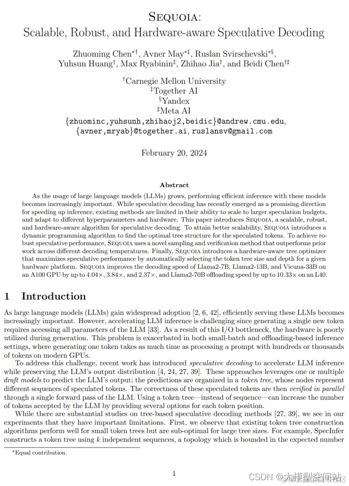 随着大语言模型(LLMs)的使用增长,使用这些模型进行高效推断变得越来越重要。尽管最近涌现出了猜测解码作为加速推断的一种有前途的方法,但现有方法在扩展到更大的猜测预算以及适应不同的超参数和硬件方面存在局限。本文介绍了Sequoia,这是一种可扩展、强大且硬件感知的猜测解码算法。为了获得更好的可扩展性,Sequoia引入了一个动态规划算法,以找到最佳的用于被猜测的token的树结构。为实现强大的猜测性能,Sequoia采用了一种新颖的抽样和验证方法,在不同的解码温度下优于先前的工作。最后,Sequoia引入了一种硬件感知的树优化器,通过自动选择给定硬件平台的token树大小和深度,最大限度地提高猜测性能。评估结果显示,Sequoia将Llama2-7B、Llama2-13B和Vicuna-33B在A100上的解码速度提高了最多达4.04倍、3.84倍和2.37倍,以及Llama2-70B在L40上的卸载速度最多提高了10.33倍。