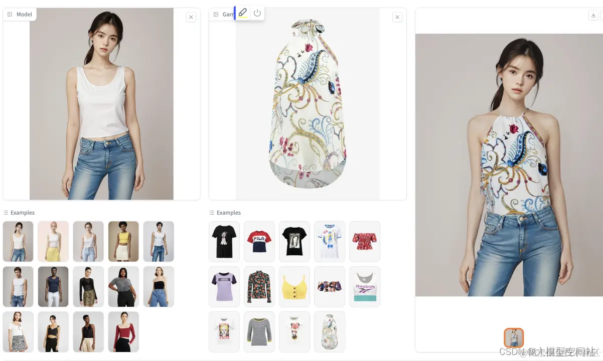 选择喜欢的衣服,看不同穿搭的生成效果,实现快速试衣。