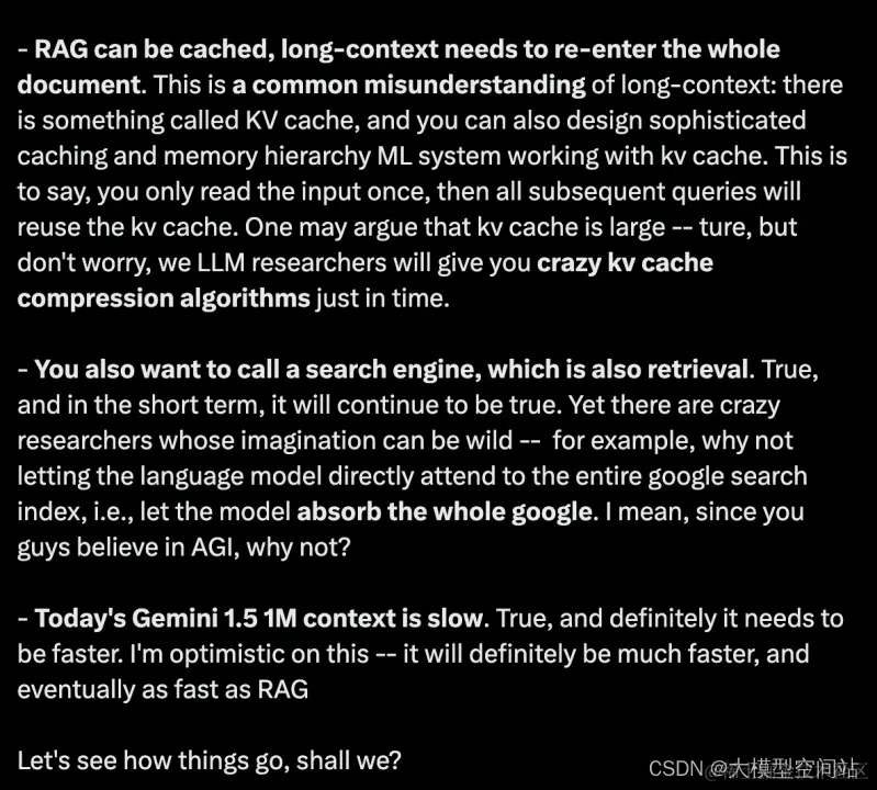 •今天的Gemini 1.5 1M上下文很慢。确实如此,它肯定需要更快。我对此持乐观态度——它肯定会快得多,并最终与RAG一样快