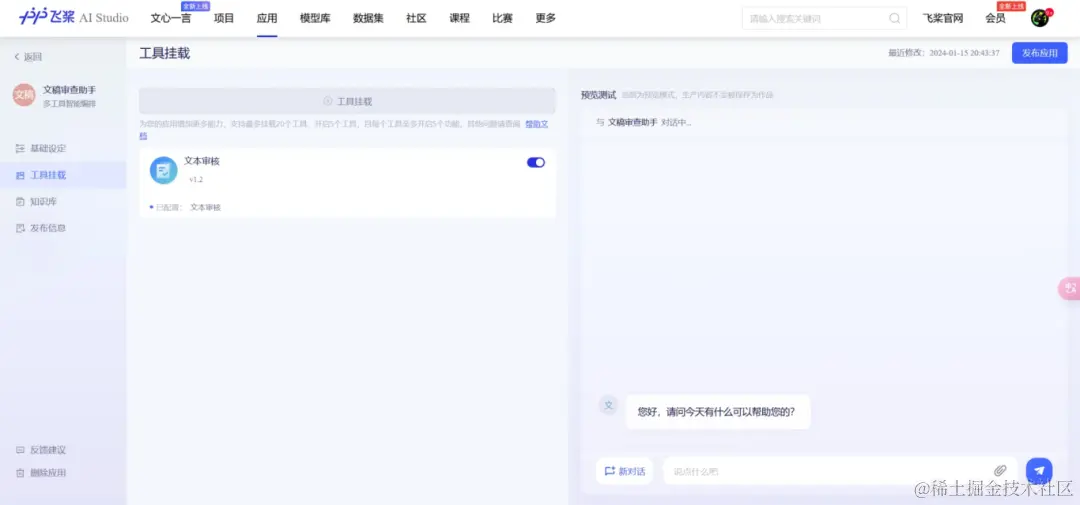 其次,在侧边栏工具挂载中点击挂载“文本审核工具”,这是飞桨星河社区工具中心提供的30多个预制工具之一,你也可以创建自己的工具。