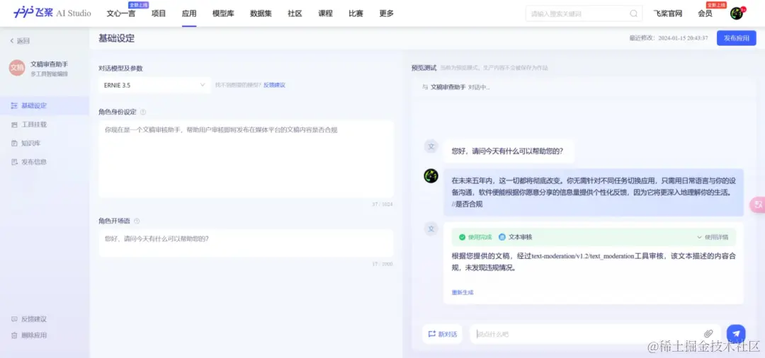继深度探索ERNIE SDK后,我们再来看看飞桨星河社区的多工具智能编排功能。飞桨星河社区不仅提供了细粒度的SDK,以支持技术开发者的详细需求,还引入了多工具智能编排功能。这意味着开发者可以基于强大的文心大模型,轻松整合各种外部工具,打造个性化的AI应用。相比起单纯使用ERNIE SDK,这种方法更快速、便捷,大大简化了开发过程。我们将使用多工具智能编排复现文稿审核助手。