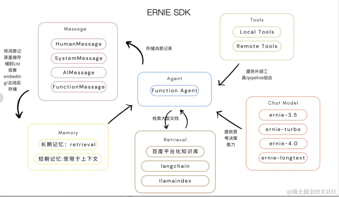 LangChain/LlamaIndex;实现自定义记忆模块ERNIE SDK允许开发者自由集成LlamaIndex等框架,可以实现更复杂的记忆模块,利用LlamaIndex优秀的文档检索能力,能够做到更长期的记忆。