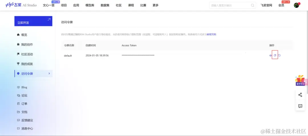 第二步,登录飞桨星河社区后,点击本人的头像,在控制台中获取自己的访问令牌,飞桨为每个新注册的用户提供100万额度的免费Token。