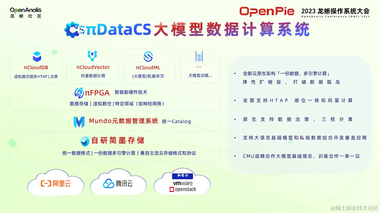 拓数派一直秉持着“开放互信、合作共赢”的理念,致力于构建蓬勃的数据生态。πDataCS 也非常注重软件生态打造,注重与社区方面的合作。πDataCS 需要适配各种各样的云环境,所以需要打造强大的软件生态系统。拓数派团队针对不同的部署方式与龙蜥平台进行了全方位的测试,测试结果显示,龙晰平台安全稳定、性能优异。因此,我们确信,龙蜥平台可以支持 πDataCS 良好运行。 除了龙蜥外,πDataCS 也完成了与其他主流软硬件平台的适配工作。拓数派将继续努力,打造完善的产品生态,为用户提供更安全稳定、高性能、易用的大模型数据计算平台。